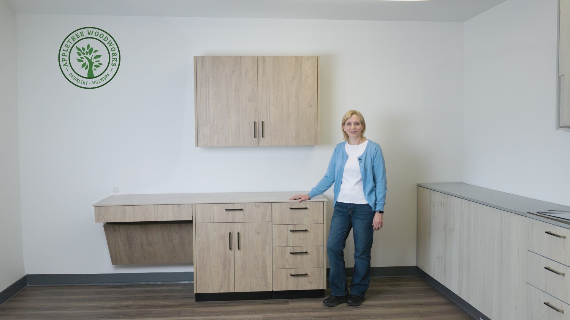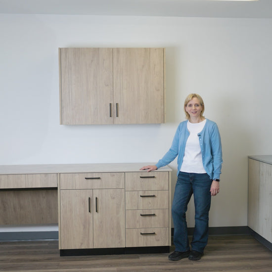 Assembled ADA-compliant laminate angled roll-up sink base in durable textured thermal-fused antimicrobial laminate. Accessible via wheelchair roll-up. Removable front slanted panel for easy access to plumbing. Sink and countertop not included. Can also be used as a counter or desktop.