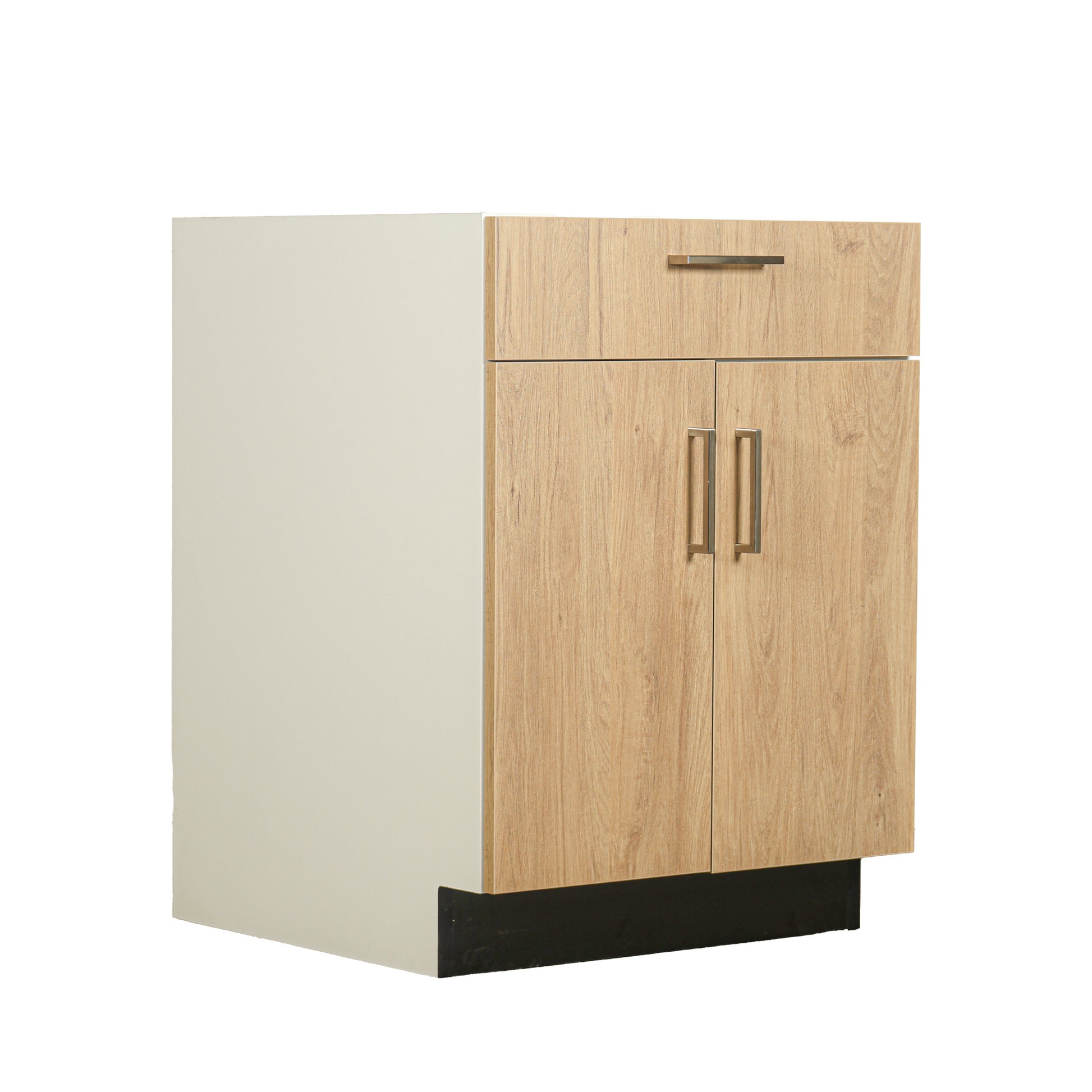 Assembled two-door, single-drawer base cabinet in durable textured thermal-fused antimicrobial laminate and soft-close concealed hinges. Drawer constructed with metal sides, melamine bottoms, and integrated undermount soft-close slides. Includes modern handles (style and color may vary). Handle holes are pre-drilled for easy attachment by customer. One adjustable shelf included. Adequate depth for files and binders. All cabinets come with standard white melamine sides and standard black toe kicks.