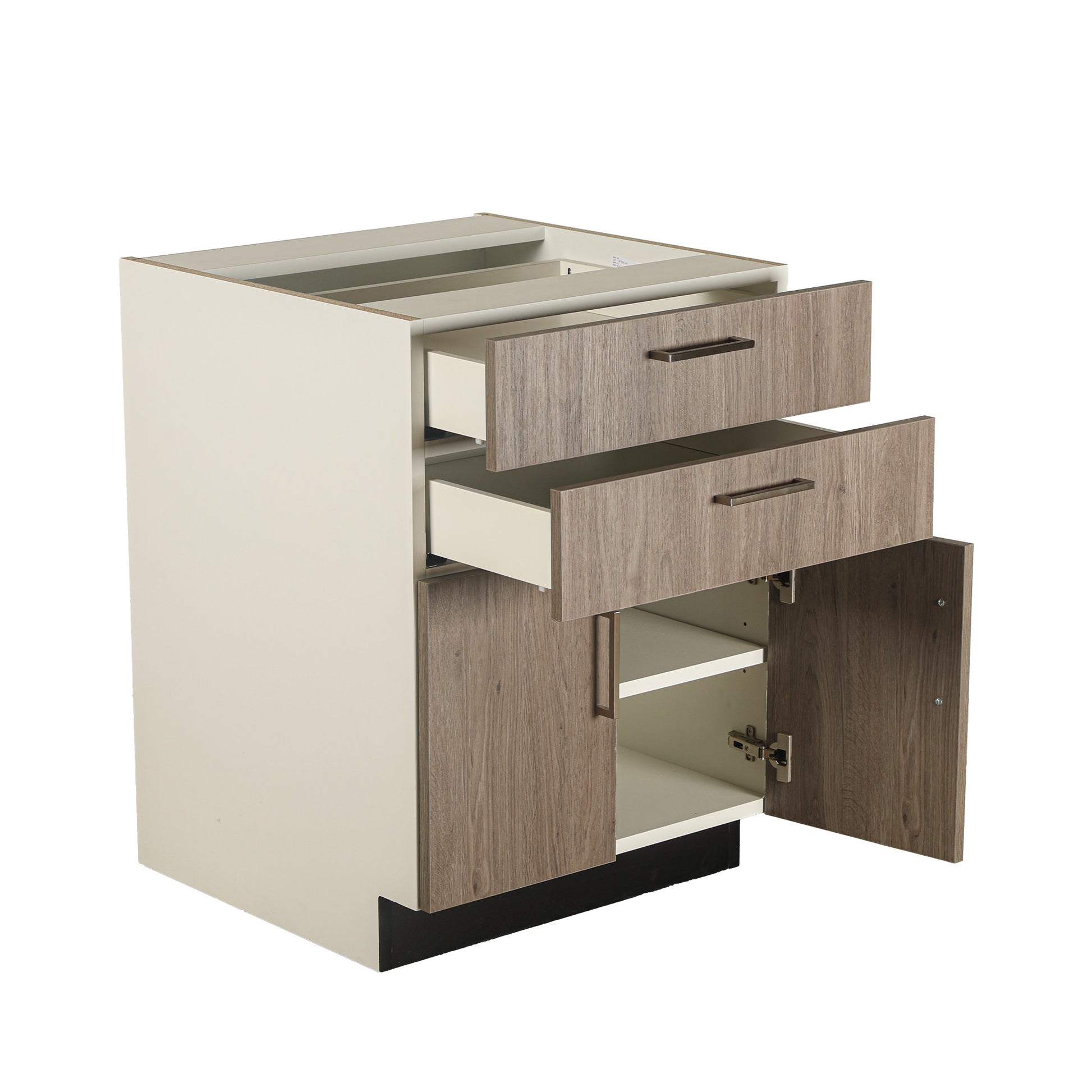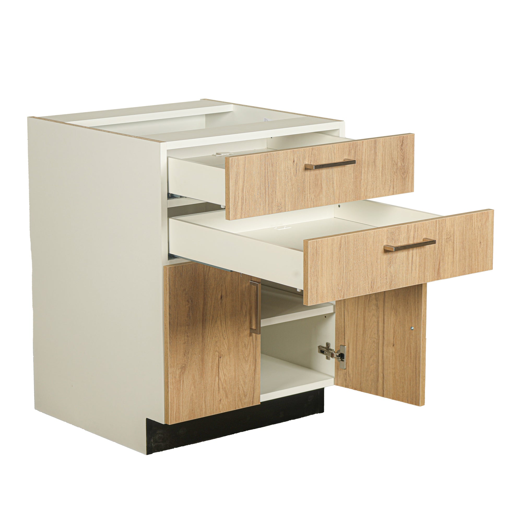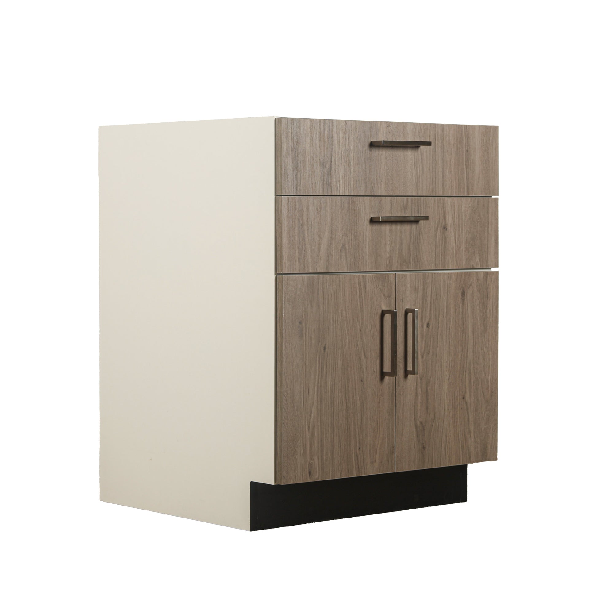 Assembled two-door, two-drawer base cabinet in durable textured thermal-fused antimicrobial laminate and soft-close concealed hinges. Drawer constructed with metal sides, melamine bottoms, and integrated undermount soft-close slides. Includes modern handles (style and color may vary). Handle holes are pre-drilled for easy attachment by customer. One adjustable shelf included. Adequate depth for files and binders. All cabinets come with standard white melamine sides and standard black toe kicks.
